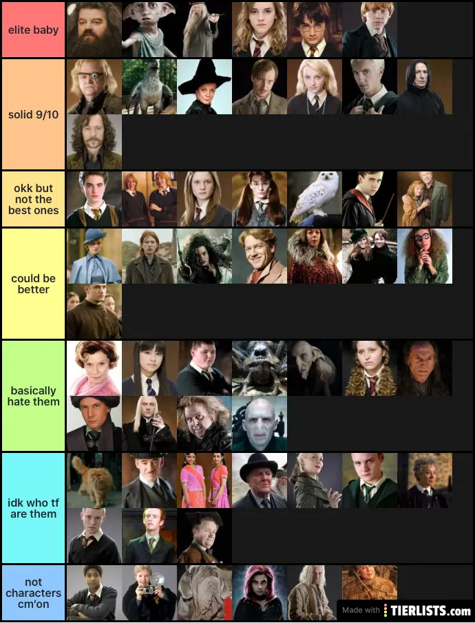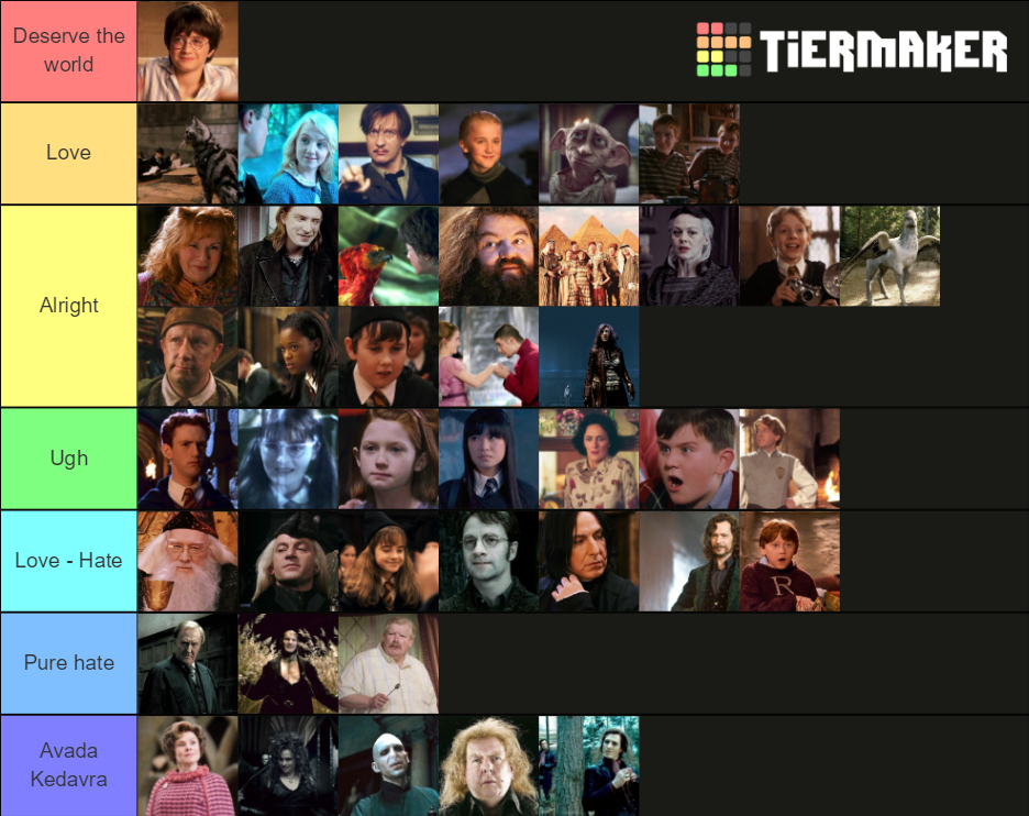Harry Potter Characters Tier List . Lomo is the best platform for creating and sharing Tier Lists! Welcome to r/HarryPotter, the place where fans from around the world can meet and discuss everything in the Harry Potter universe! Be sorted, earn house points, debate which actor portrayed Dumbledore the best and finally get some closure for your Post-Potter Depression.